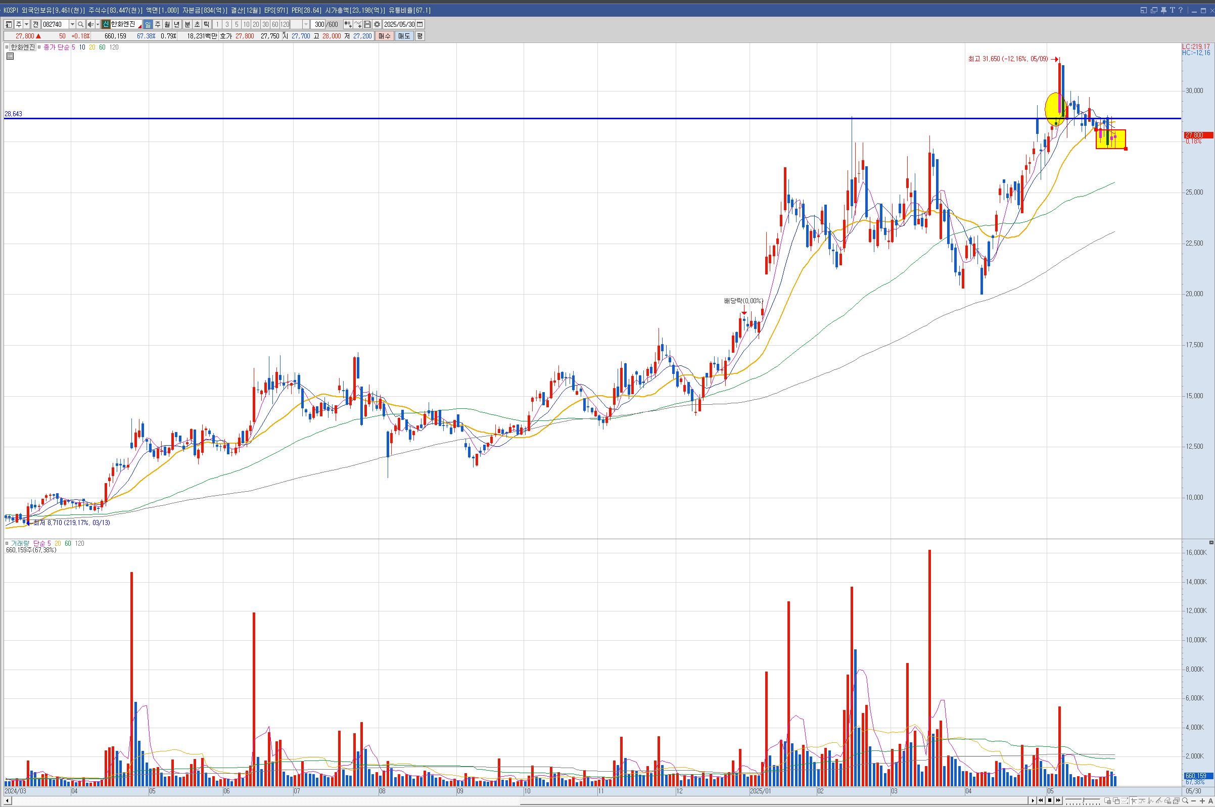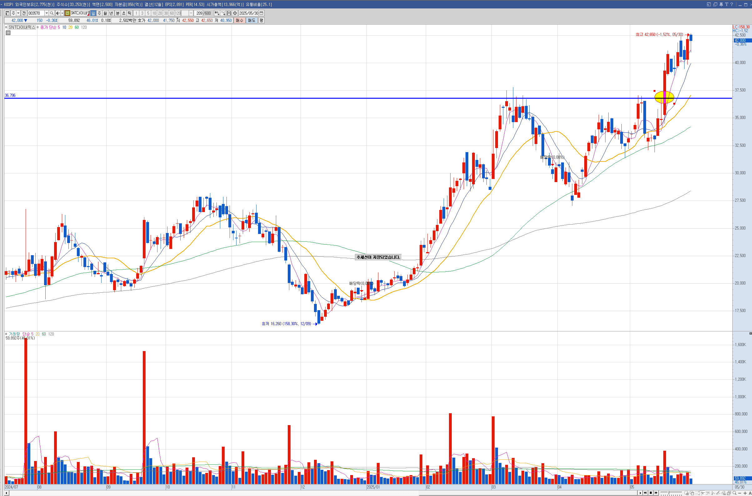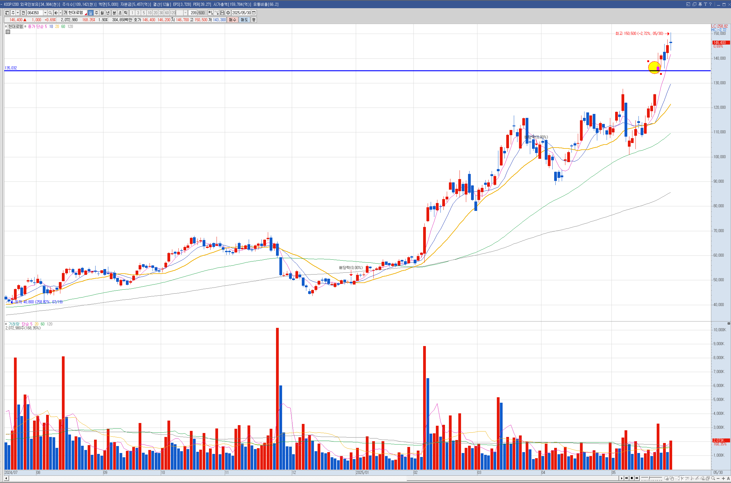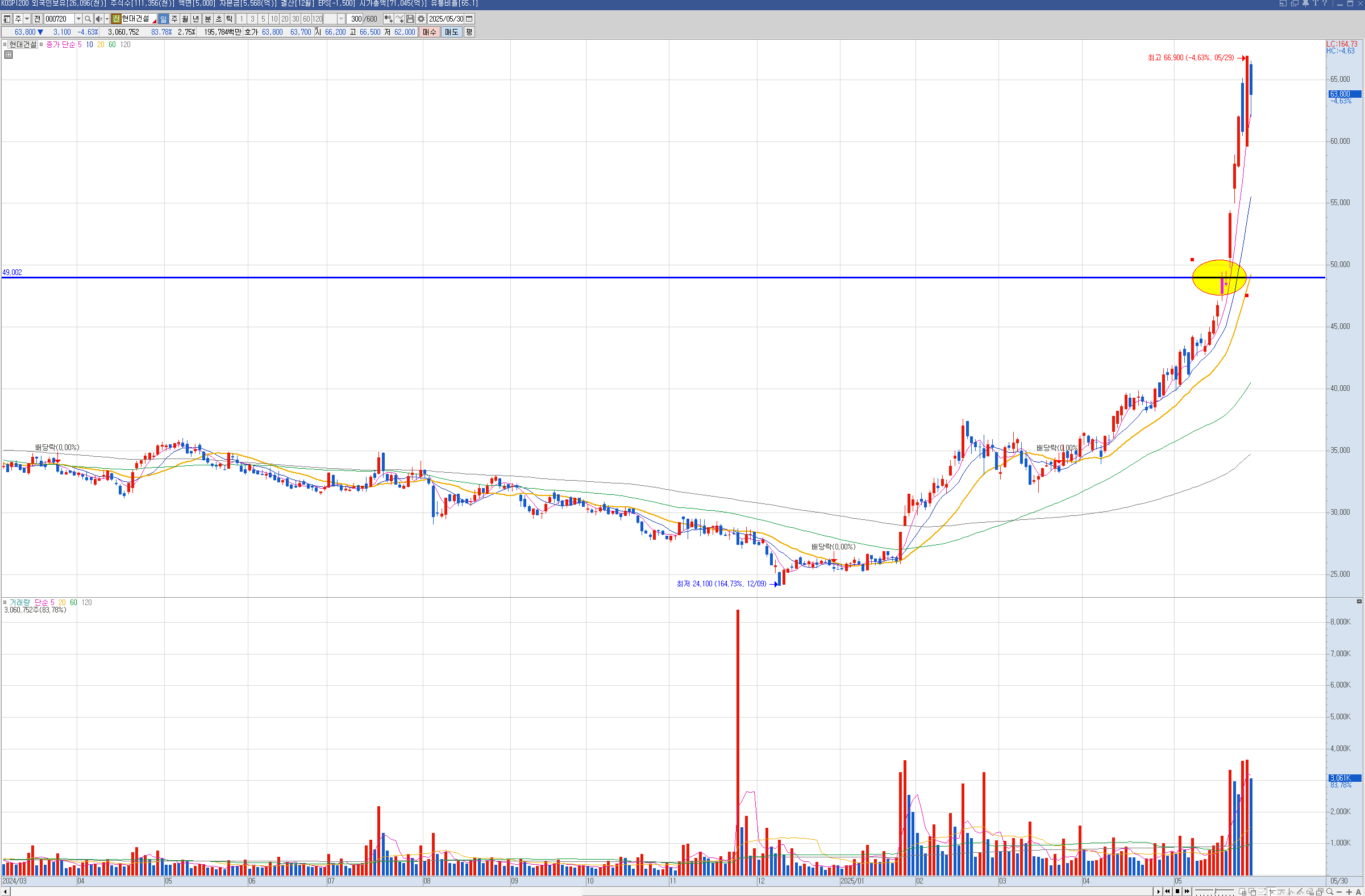 제닉 현대건설은 주봉이 역배열이라 나는 안샀는데 벨류업으로 묶이면서 많이 올랐습니다.