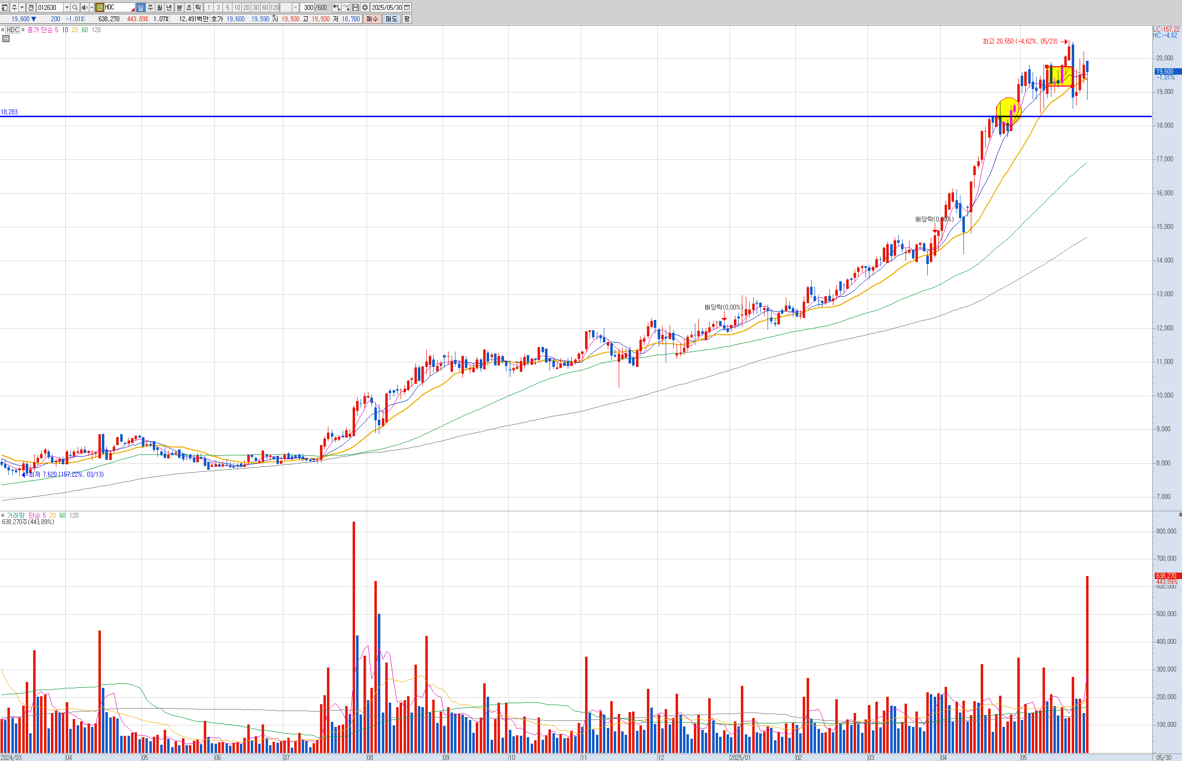 HDC는 8% 정도 수익으로 트레일링 스탑했습니다. 고점 부근에서 횡보가 길어진탓에 물량을 정리했습니다.